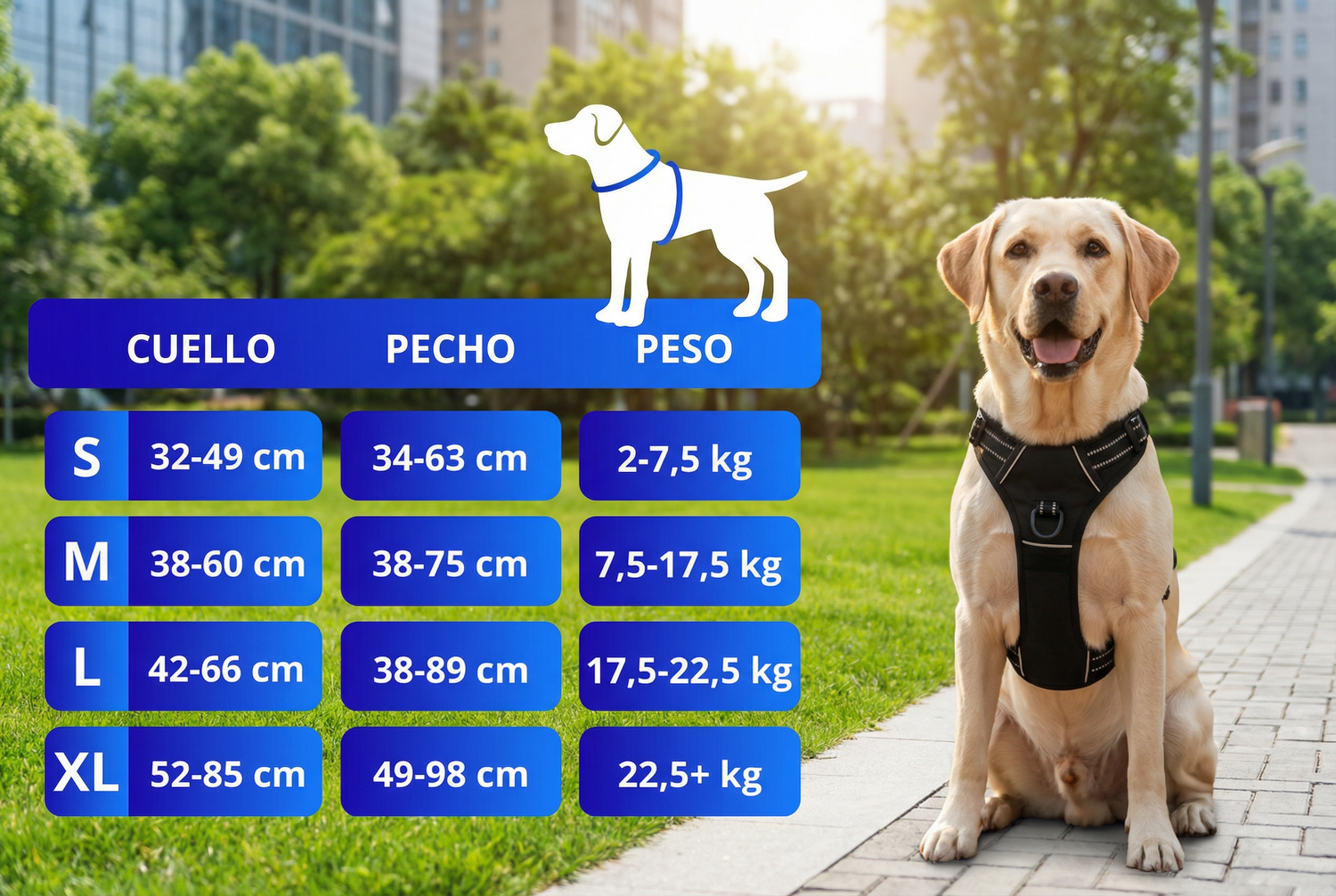 Si tu perro está entre dos tallas, elige la mayor; las correas ajustables permiten adaptarlo de forma individual.